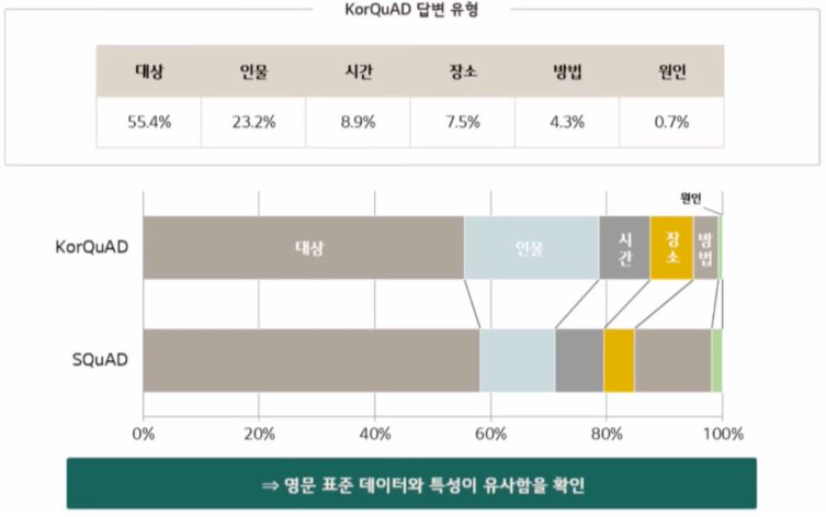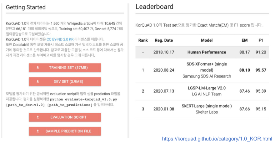 KorQuAD란, LG CNS가 AI 언어지능 연구를 위해 공개한 질의응답/기계독해 한국어 데이터셋
