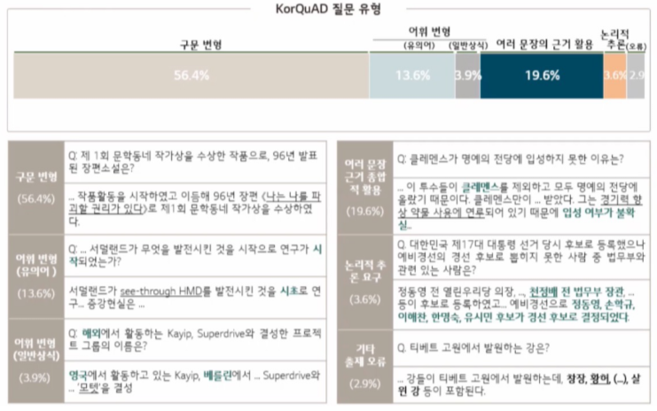 또한, 오답의 62% 가량이 실제 오답이며, 나머지 38%는 중복 답안(Incomplete Annotation), 각기 다른 시기, 관점, 질문의 해석에 따라 정답이 될 수 있거나(Unanswerable), 정답의 다른 표현을 낸 경우(Phrasing Mismatch)이므로 실제 성능은 더욱 증가한다.