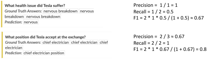 • F1 = $\frac{2\times Precision \times Recall}{Precision+Recall}$, $Precision=\frac{num(same\ token)}{num(pred\ tokens)}$, $Recall=\frac{num(same\ token)}{num(ground_tokens)}$