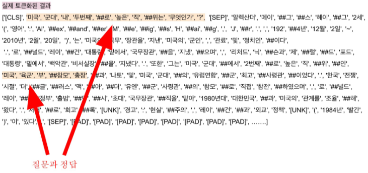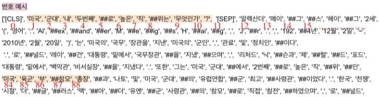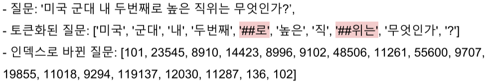 “미국 군대 내 두번째로 높은 직위는 무엇인가?” => [‘미국’, ‘군대’, ‘내’, ‘두번째’, ‘##로’, ‘높은’, ‘직’, ‘##위는’, ‘무엇인가’, ‘?’]
