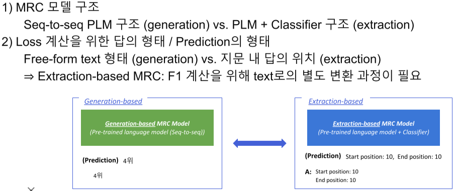 분류(Classification) 문제와 비슷하며, 주로 이전에 배웠던 F1 score나 EM을 지표로 삼는다.