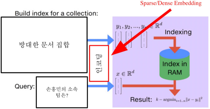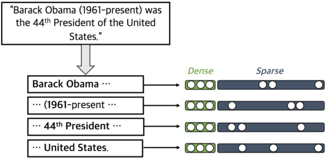 이때, 각 phrase를 vector space 상에 잘 mapping 하기 위해 Dense와 Sparse 임베딩을 둘다 이용하게 된다.
