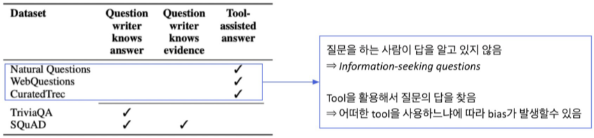 예를 들어 SQuAD나 TriviaQA는 질문을 하는 사람이 답을 아는 상태로 tagging 했으므로, 너무 쉬운 학습이 된다.