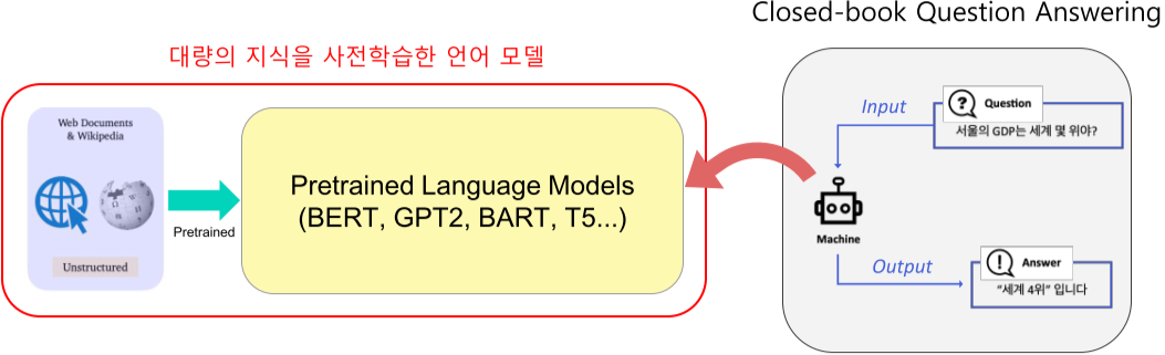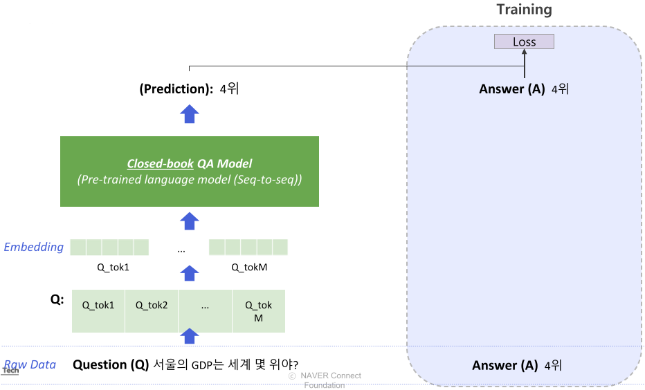 Generation-based MRC와 유사하지만 Context가 없이 질문만 들어가며, Retriever 단계가 없다.