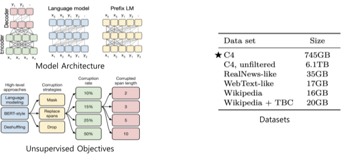 T5의 Pre-training 모델의 경우 다양한 모델 구조, 사전학습 목표, 사전학습용 데이터, Fine-tuning 방법 등을 체계적으로 실험함, 가장 성능이 좋은 방식들을 선택하여 방대한 규모의 모델을 학습 시킴