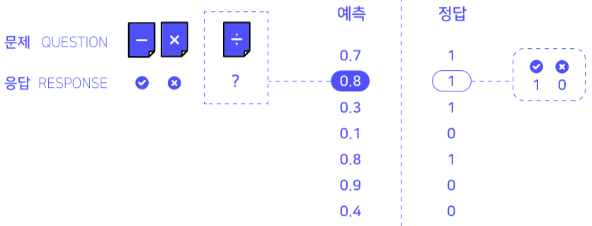 ๋ณดํต ์์ธก์ ๊ฒฐ๊ณผ๋ float ํํ๋ก ๋์ค๋ฉฐ, 0.5(Threshold)๋ฅผ ๊ธฐ์ค์ผ๋ก ์ ๋ต ์ฌ๋ถ(1,0)๋ฅผ ๊ฒฐ์ ํ๋ค.