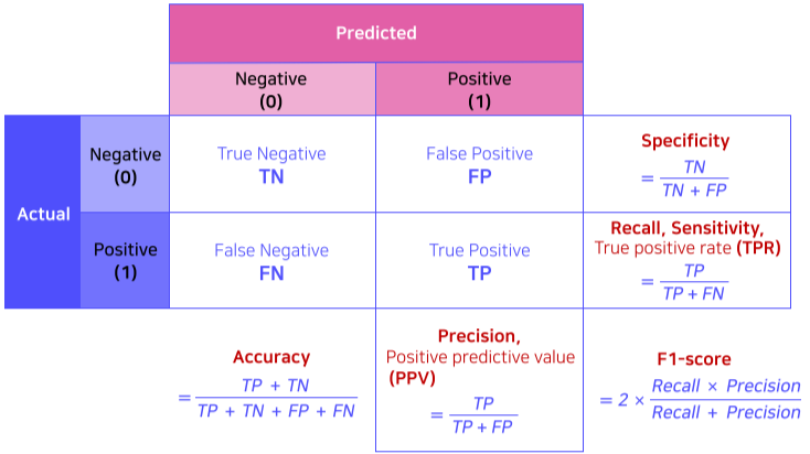 Recall,Sensitivity (True positive rate(TPR)): ์ค์ 1์ธ ๋น์จ ์ค์ ๋ชจ๋ธ์ด 1์ด๋ผ๊ณ ํ ๋น์จ