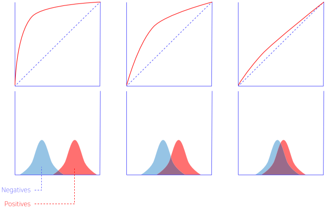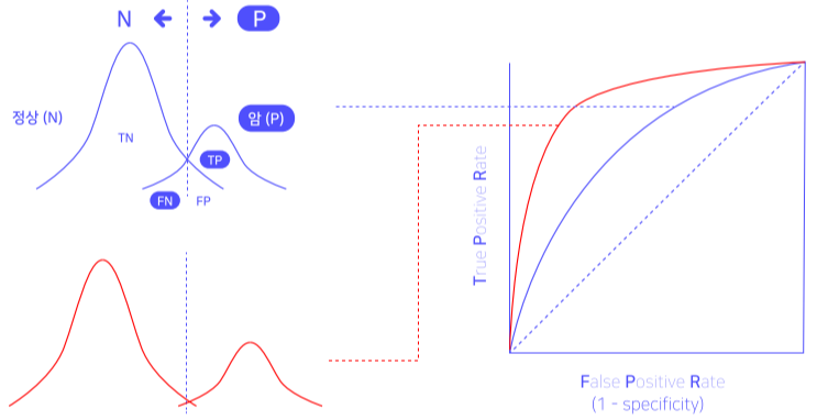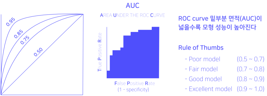 ์์ ๊ฐ์ด Threshold ์ง์ ์ ์ค์ฌ์ผ๋ก ๊ฒน์น๋ ๋ถ๋ถ (=์์ธก์ด ํ๋ฆฐ ๋ถ๋ถ)์ด ์ ์์๋ก ROC Curve์ ๋ฉด์ ์ด ๋์ด์ง๊ณ , ์ฑ๋ฅ์ด ์ข๋ค๋ ์๋ฏธ์ด๋ค.