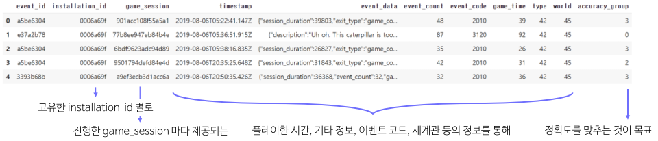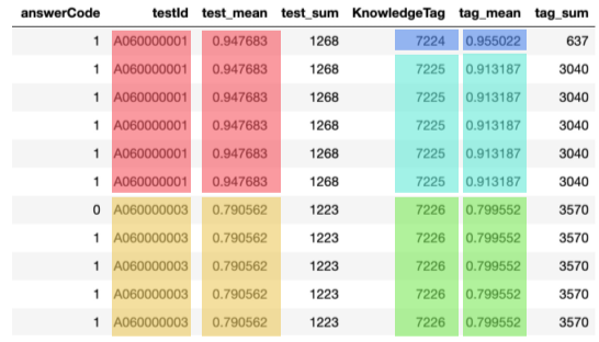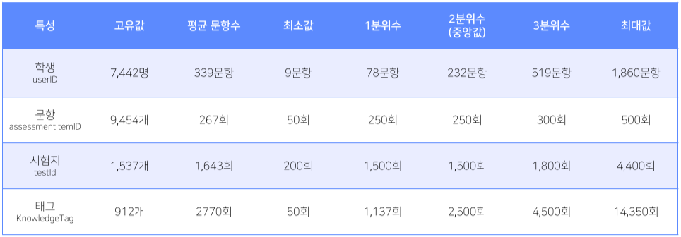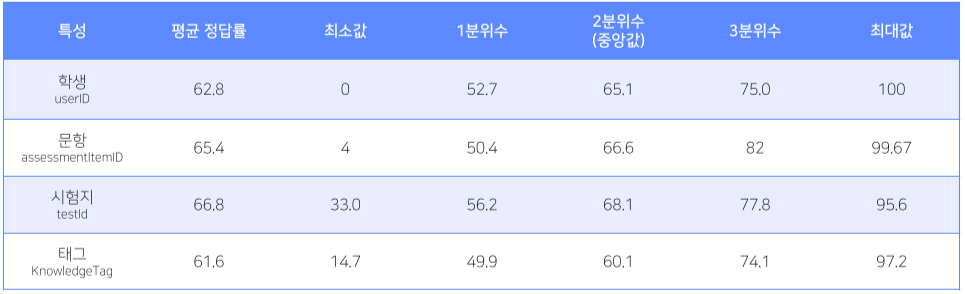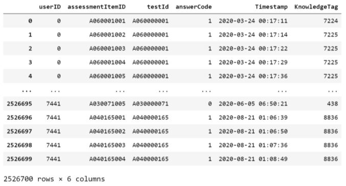 feature๋ก userID, assessmentItemID, testId, answerCode, Timestamp, KnowledgeTag๋ก ์ด๋ฃจ์ด์ง.
