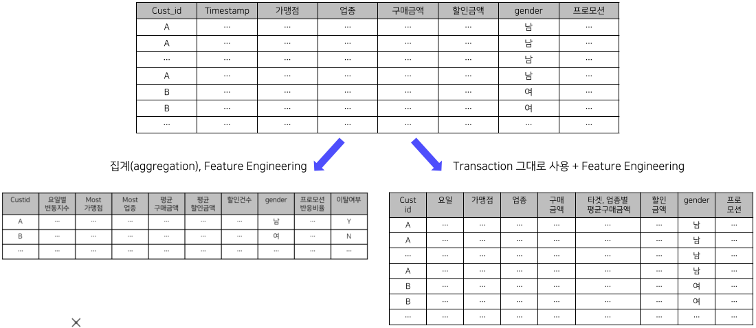 - ๋ง์ Feature Engineering์ ํตํด, ๋ค๋์ Feature๋ฅผ ํ์๋ก ํ๊ณ , ์ ์๋ฏธํ ๊ฒ์ ์ฐพ์๋ด์ผ ํ๋ค.