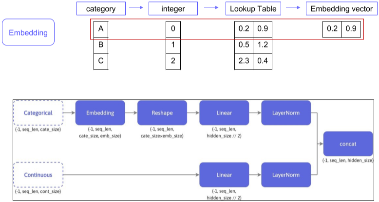 ๋ฒ์ฃผํ ๋ฐ์ดํฐ์ ๊ฒฝ์ฐ, ์๋ฒ ๋ฉ ํ๋ ฌ์ ํ ์ด์ ์ฌ์ฉํ๋ ํํ์ด๋ฉฐ, ์ฐ์ํ์ ๊ทธ๋ด ์ ์์ผ๋ฏ๋ก, ์๋ฒ ๋ฉ ๋์ , ์ฃผ์ด์ง ์ฐ์ํ ๋ฐ์ดํฐ ๊ฐ์ ๊ฐ์ค์ ๋ ๋๊ณ , ๊ทธ ์ฃผ๋ณ ๊ฐ๋ค์ ๋ ์์ ๊ฐ์ค์ ์ฃผ์ด, ์ด ์๋ฒ ๋ฉ ํ๋ ฌ์ ํน์ ์ด๋ค์ ๊ฐ์คํฉํ ๋ฒกํฐ๋ฅผ ์๋ฒ ๋ฉ์ผ๋ก ์ฌ์ฉํจ.