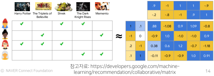 ์ถ์ฒ ์์คํ ์์ ๋ง์ด ์ฌ์ฉ๋๋ Matrix Factorization ๋ฐฉ์์ผ๋ก ์ฌ์ฉ์์ ๋ฒกํฐ์ ๋ฌธํญ์ ๋ฒกํฐ๋ฅผ ๋ง๋ค ์ ์์. (์ต๊ทผ์๋ Factorization Machine์ ๋ง์ด ์ฌ์ฉํจ.)