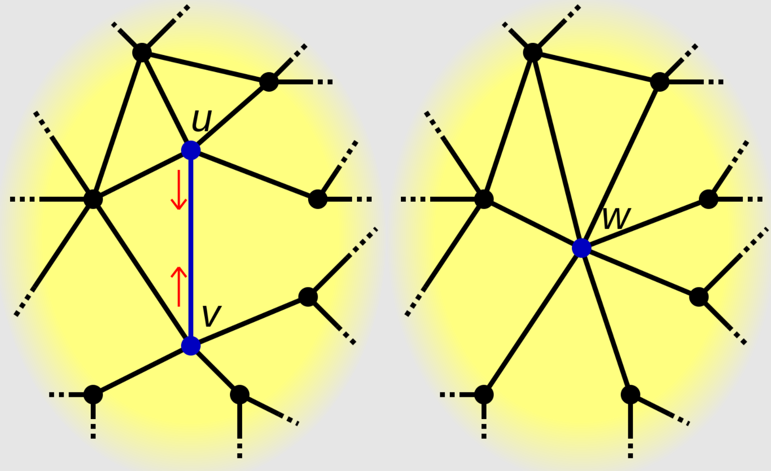 어떤 무향 그래프의 G에 대해 새로운 정점들의 집합 $V’=V-{u,v}\cup {x}$을 만들고, 정점 u와 v를 이어주는 모든 간선을 삭제한 뒤, u와 v 정점에 인접한 정점들을 새로 만든 정점 x과 연결하는 행위.