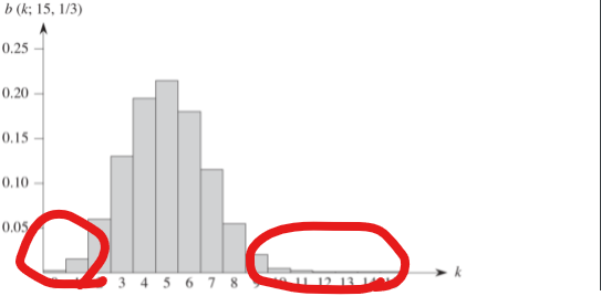 이항 분포의 가장 확률이 높은 지역인 평균($np$)에서 가장 먼 양 끝단을 이항 분포의 꼬리(tail) 부분이라고 하며, 좌측 꼬리는 최소의 성공, 우측 꼬리는 최대의 성공확률를 의미한다.