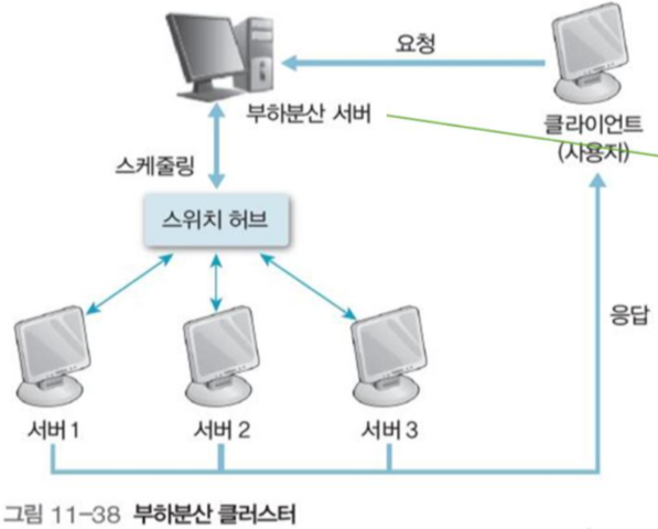 그림 11-38과 같이 외부 클라이언트의 작업 요청을 부하 분산 서버, 혹은 부하 분배기(load balancer)가 받아들여 부하량이 가장 적은 노드에 요청을 전달하는 방식이다.