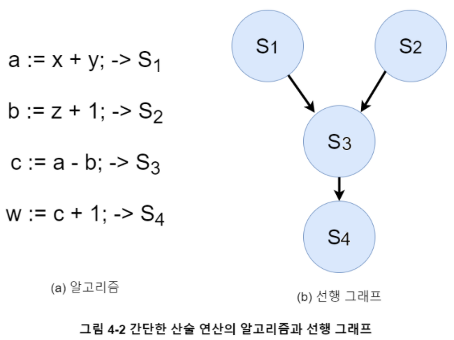 그림 4-2 (a)에서 알고리즘의 일부를 병행 수행, 예를 들어 값 a와 b를 동시에 구하려면 프로세서 하나에 기능 단위를 여러 개 두거나 프로세서를 여러 개 사용한다.