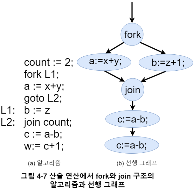그림 4-7은 fork와 join을 이용한 병행 수행과 병합을 표현한 알고리즘과 선행 그래프 예시다.