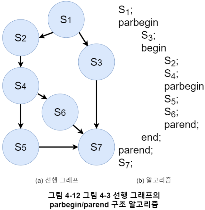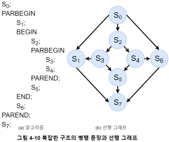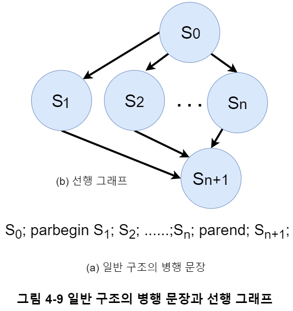 각 $S_i$는 단일 문장이고, parbegin과 parend 사이의 모든 문장은 병행 수행가능 하다. 그림 4-9 예시처럼 최초로 시작되는 프로세스인 $S_0$와 모든 프로세스가 끝난 후에 실행되는 $S_{n+1}$ 문장을 추가해 정의할 수 있다.