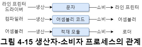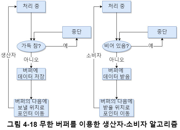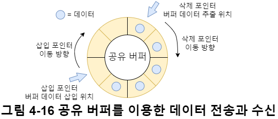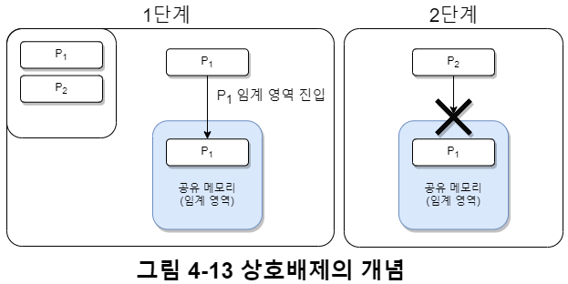 예를 들어 그림 4-13처럼 공유 메모리를 $P_1$ 프로세스가 사용하고 있으면, $P_2$는 해당 공유 메모리에 접근할 수 없도록 막아야(=상호배제) 한다.