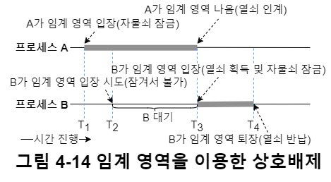 그림 4-13의 공유 메모리 같이 두 프로세스가 동시에 사용할 수 없는 공유 자원을 임계 자원(critical resource), 이러한 임계 자원에 접근하고 실행하는 프로그램 코드 부분을 임계 영역(critical section)이라 한다.