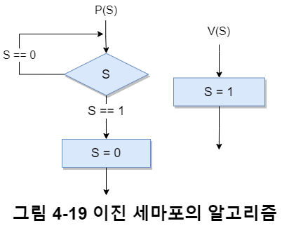 다만 이렇게 구현한 세마포는 프로세스 하나가 한 세마포의 준비 큐에만 대기할 수 있으므로, 두 프로세스가 자원을 하나씩 점유하고 상대방이 점유한 자원을 대기하는 교착상태를 유발할 수 있다.