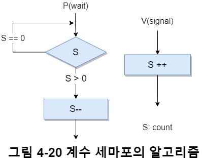 세마포의 P 연산은 언제나 차단시키지 않고 세마포가 0보다 클 경우, 자원이 충분하므로 대기하지 않고 실행되지만,