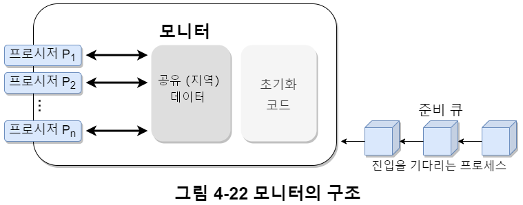 모니터는 공유 데이터, 임계 영역이 코딩된 프로시저, 초기화 코드로 구성되어 있다. 데이터 정의와 프로시저의 독점적 제어가 모두 포함되어 있다.