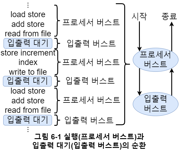 주로 그림 6-1 예시처럼 입출력 버스트와 프로세서 버스트의 순환, 특히 프로세서 버스트로 시작해 프로세서 버스트로 끝나는 경우가 많다.