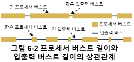 또한, 백그라운드 프로그램 같이 긴 프로세서 버스트가 많으면 입출력이 적다는 의미이므로 프로세서 중심 프로세스는 짧은 입출력 버스트를 가지는 경향이 있으며, 입출력 버스트가 잦으면, 그만큼 프로세스가 입출력을 기다리는 경우가 많다는 의미이므로 입출력 중심 프로세스는 짧은 프로세서 버스트를 많이 가지는 경향이 있다. 이는 그림 6-2에 묘사되어있다.