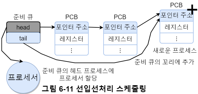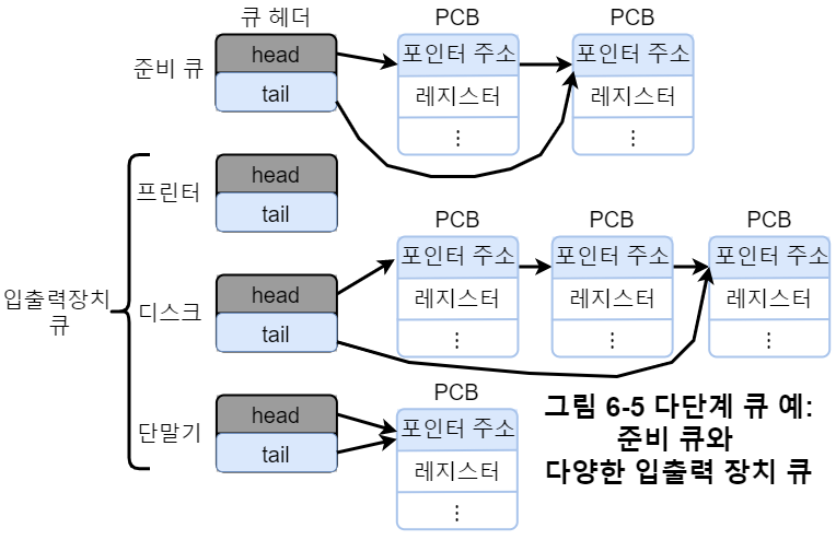 그림 6-5은 큐에 적재되어 있는 프로세스의 모습이다. 각 큐의 포인터로 head와 tail 포인터가 존재하며, 프로세스 제어 블록의 포인터 주소를 가르키고 있다. 테이프 드라이브나 시분할 단말기 같은 전용 장치는 큐에 단 하나의 프로세스만 존재 가능하지만, 디스크 같이 여러 프로세스가 줄을 서는 경우도 있다.