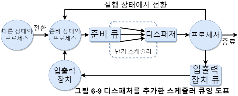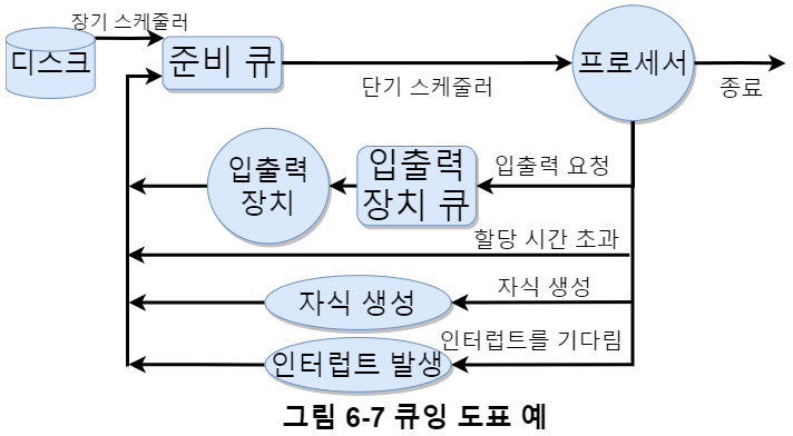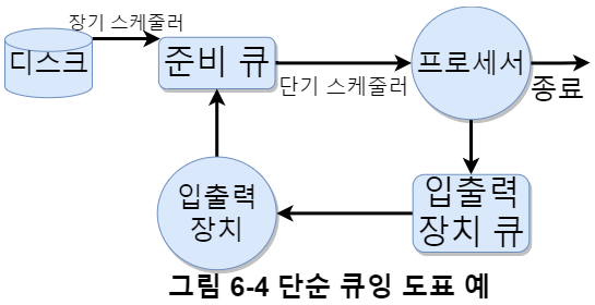 스케줄링에서 사용하는 큐는 시스템에 단 하나 있는 준비 큐와 입출력 장치별로 하나씩 있는 입출력 장치 큐가 있다. 그림 6-4는 프로세스의 큐 이동 방향이다.