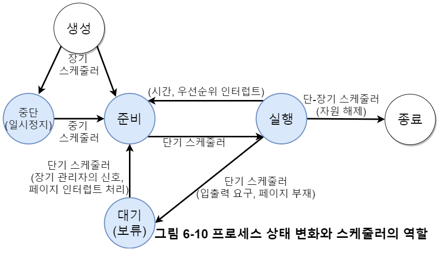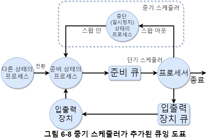 - 혼합이 필요한 예를 들자면, 입출력 프로세스만 너무 많으면 준비 큐가 거의 비어있어 단기 스케줄러가 할일이 없어 비효율적이다. 반대로 프로세서 중심 프로세스만 많으면 입출력 준비 큐가 비어있으면서 프로세서들이 병목 현상을 겪을 것이다.