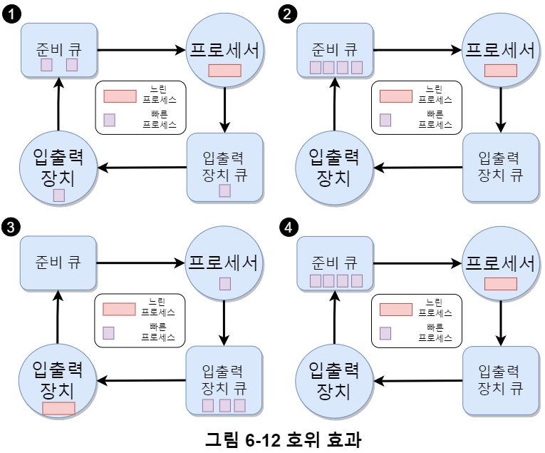 이때 입출력 중심 프로세스를 실행 뒤 프로세서 중심 프로세스로 바뀌면 짧은 지연이 생기며, 반대의 변화의 경우 긴 지연이 걸린다.