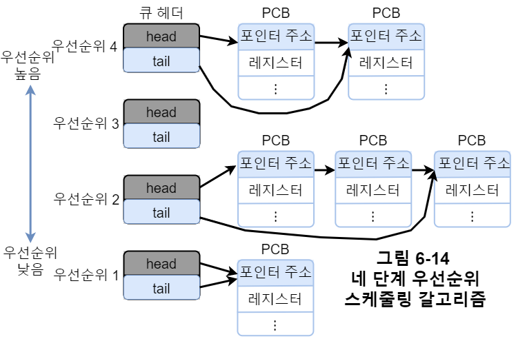 무조건 우선순위 높은 프로세스가 남아있는한 낮은 프로세스가 실행되지 않는 절대적인 우선순위 스케줄링이나 낮은 우선순위의 큐는 더 적은 시간을 할당받는 스케줄링도 가능하다.