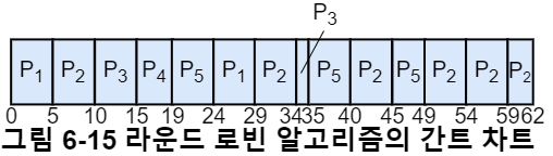 규정 시간량이 5인 라운드 로빈 스케줄링의 예시를 들어보자.(그림 6-15)