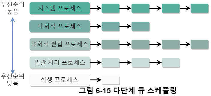 큐 사이의 스케줄링은 보통 선점 우선순위 스케줄링을 이용한다.(그림 6-15)