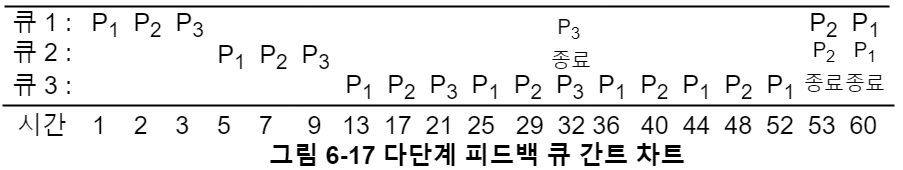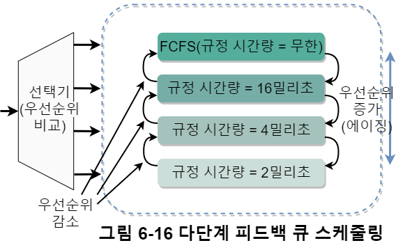 또한 그림 6-16 처럼 우선순위가 높은 큐는 규정 시간량을 적게두고, 우선순위가 낮은 큐는 규정 시간량을 크게 두게 설정한다. 이를 통해 자원의 공정성을 어느 정도 해결한다.