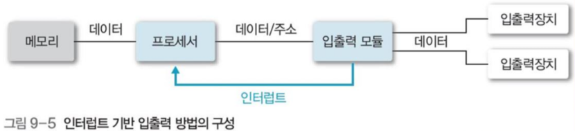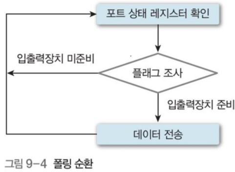 데이터 전송 시에는 장치의 포트 상태 레지스터에 저장되있는 입출력 장치의 상태 비트를 폴링 순환 (그림 9-4)을 통해 검사한다.