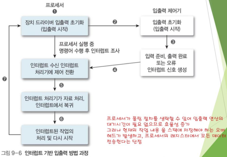 위 그림은 인터럽트 기반 입출력 방법의 과정이다.