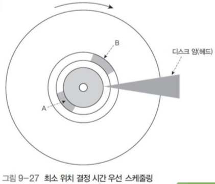 위 그림 같은 경우 긴 시간이 걸리는 회전 지연시간이 더욱 긴 A보다는 다른 트랙에 있어 탐색 시간이 더 걸리더라도 회전 지연시간이 짧은 B를 먼저 처리할 것이다.