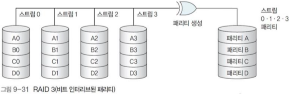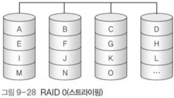 그림 9-28에서 데이터 ABCD를 A, B, C, D로 병렬로 분산 저장했는데, 이 각각의 A, B, C, D를 스트립(strip)이라고 하며, 연속된 데이터 ABCD는 스트라이프(stripe)라고 한다.