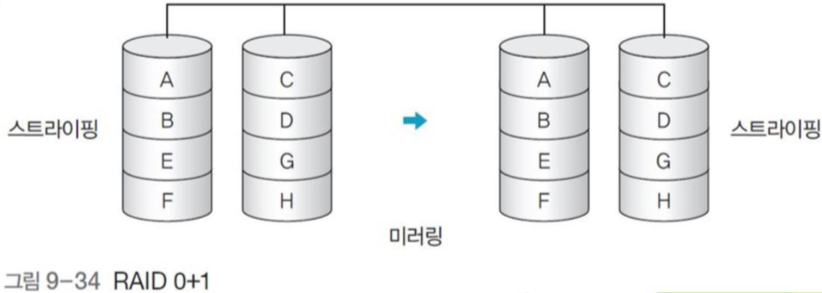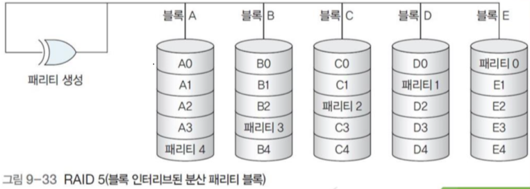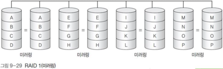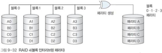 - 그림 9-29의 경우에는 쓰기 성능 또한 4배 증가하는게 맞다. 다만 맨 앞에 두 디스크만 있는 경우는 쓰기 성능은 1배이다.