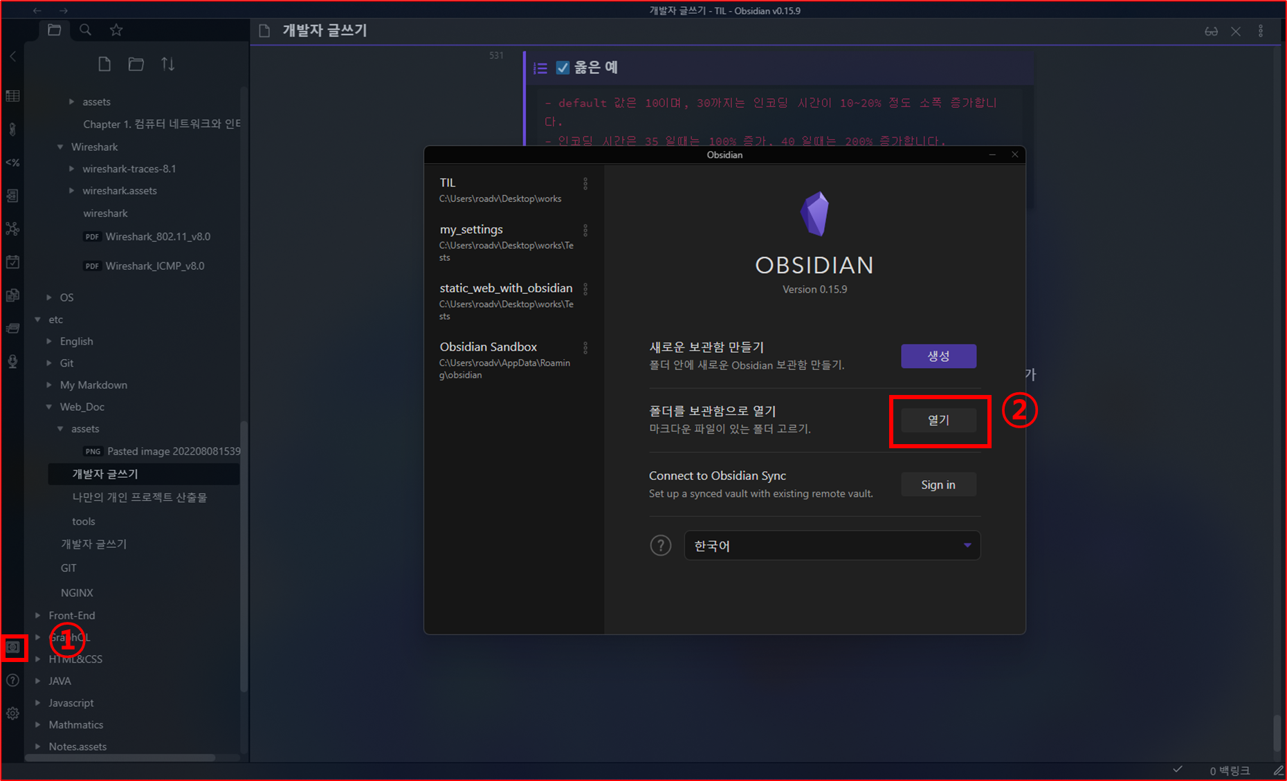 다른 보관함을 열려면 ① 다른 보관함 열기 > ② 열기 버튼을 눌러 원하는 폴더를 엽니다.
