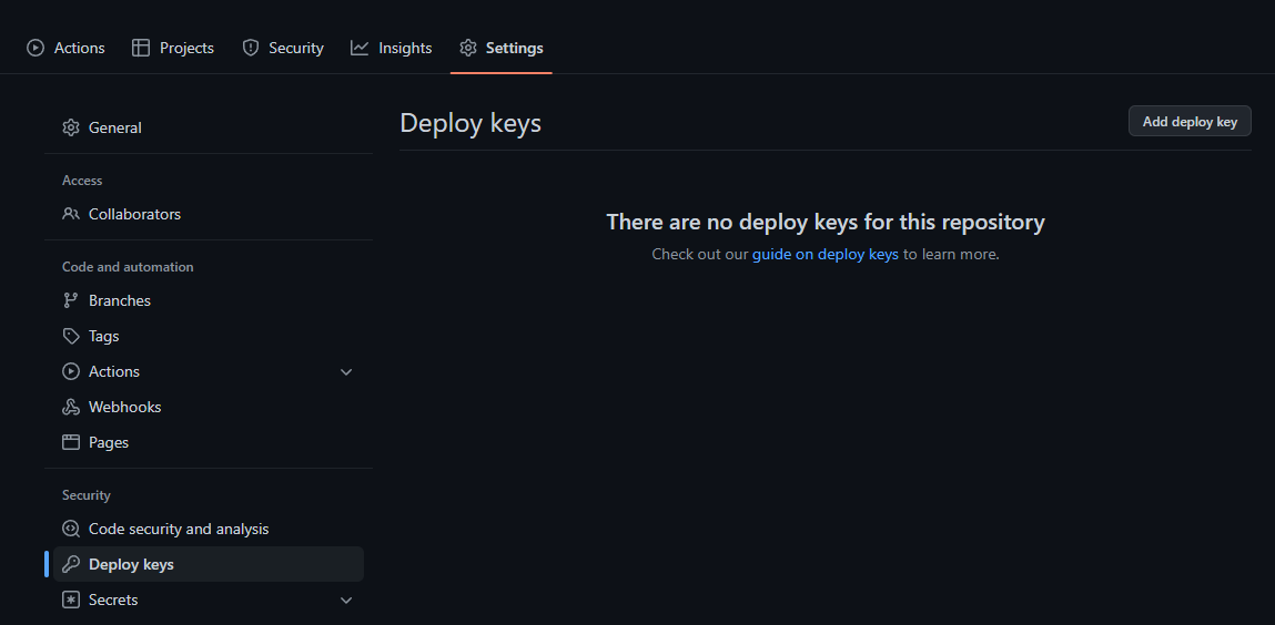 cat ๋ช…๋ น์–ด๋ฅผ ํ†ตํ•ด ์ƒ์„ฑ๋œ ํ‚ค๋ฅผ ๋ณต์‚ฌํ•˜๊ณ  ์ด๋ฅผ ๋Œ€์ƒ GIT repository -> Settings -> Deploy keys -> Add deploy key์— ํ‚ค ์ด๋ฆ„๊ณผ ํ‚ค๋ฅผ ์ €์žฅํ•œ๋‹ค.